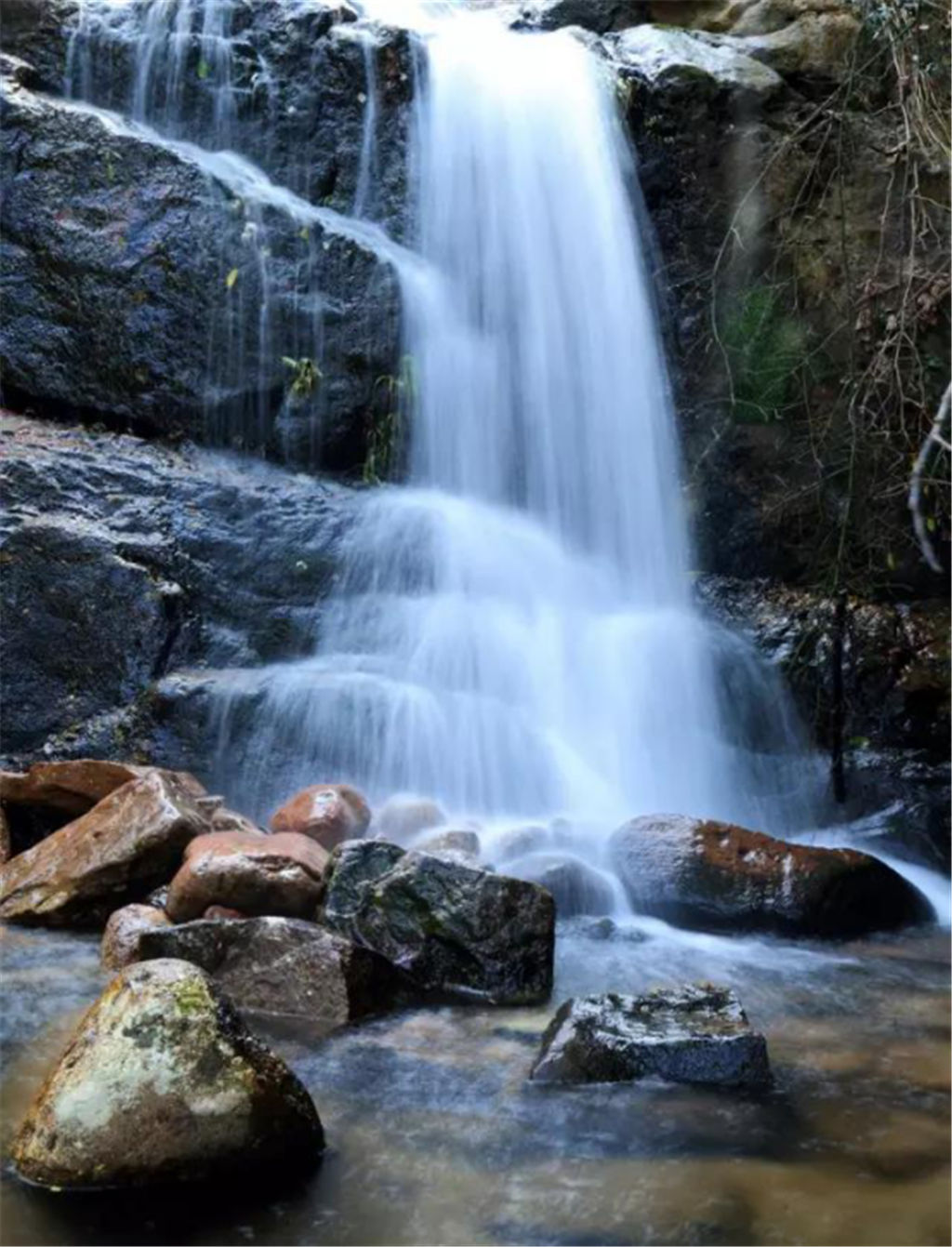 豐水期,遠(yuǎn)遠(yuǎn)的未見其水,便聞其聲,隆隆的水聲如雷鳴般響徹山谷,清澈的山泉水順著山勢歡快地奔騰而下,水流沖落在瀑布下的巖石上,飛濺起粒粒的水珠,銀白閃亮,就像晶瑩的珍珠正在翻滾跳躍。