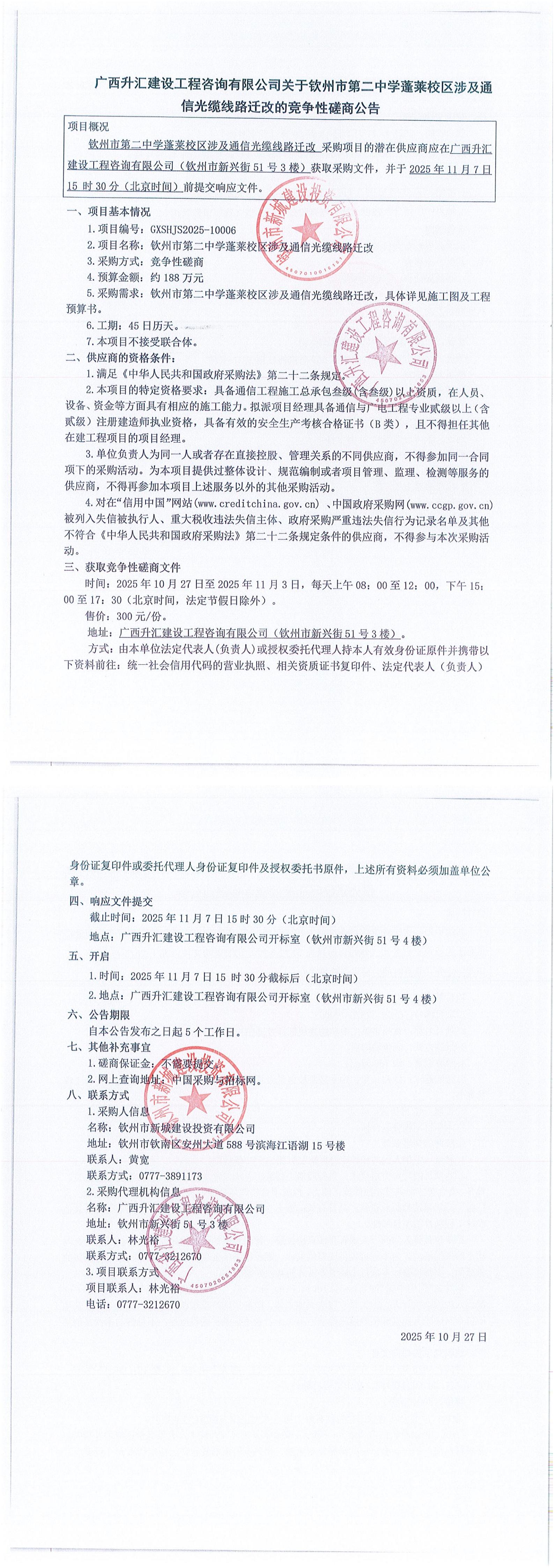 欽州市第二中學(xué)蓬萊校區(qū)涉及通信光纜線路遷改(項(xiàng)目編號(hào): GXSHJS2025-10006)更正公告(二)