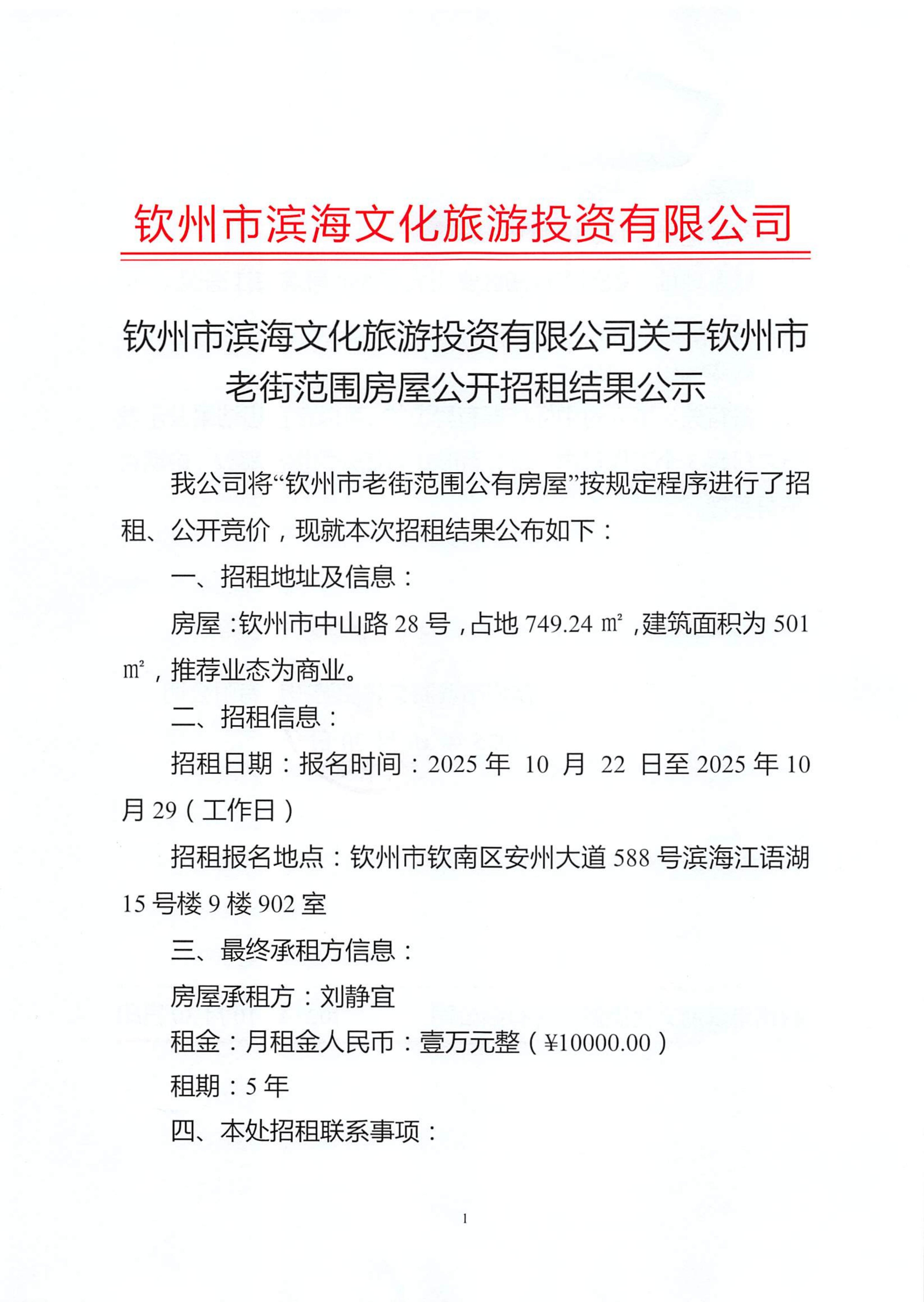 欽州市濱海文化旅游投資有限公司關(guān)于欽州市老街范圍房屋公開(kāi)招租結(jié)果公示