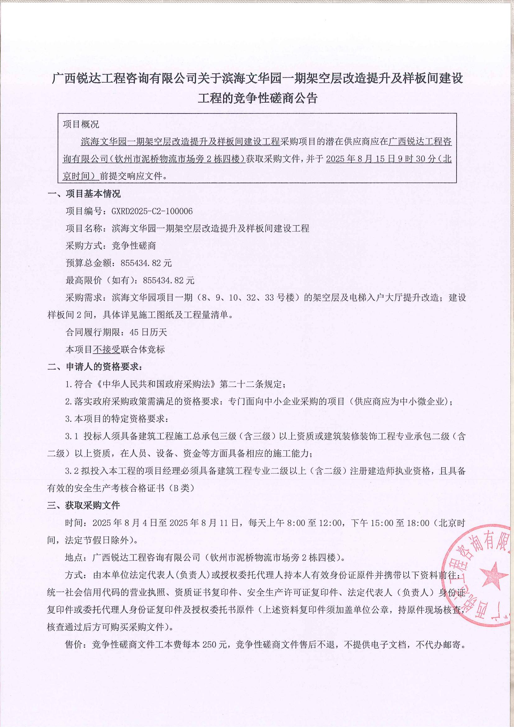 廣西銳達(dá)工程咨詢有限公司關(guān)于濱海文華園一期架空層改造提升及樣板間建設(shè)工程的競(jìng)爭(zhēng)性磋商公告