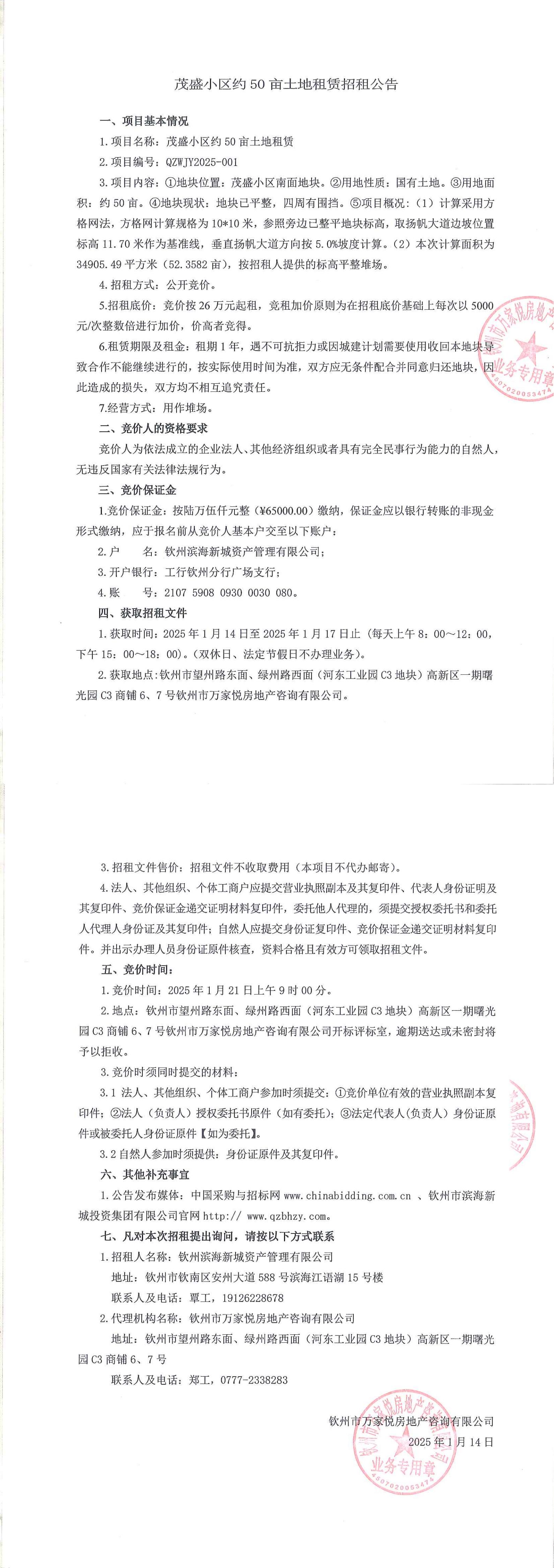 茂盛小區(qū)約50畝土地租賃(QZWJY2025-001)成交結(jié)果公告