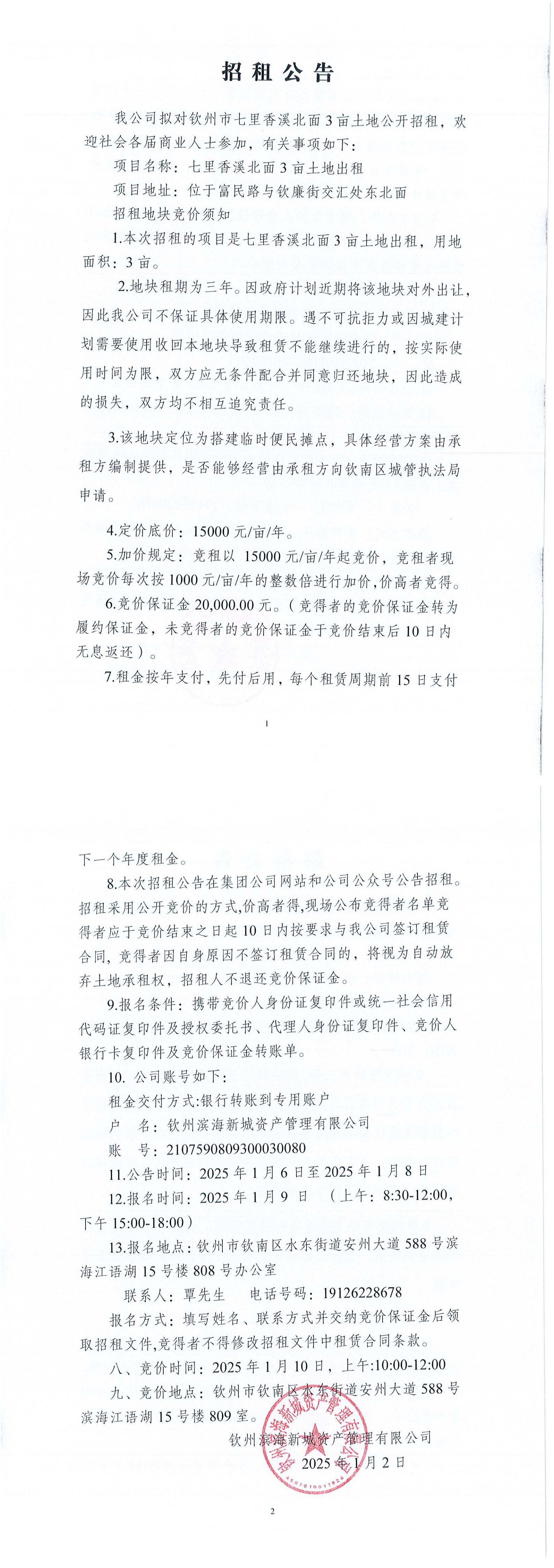 招租公告(欽州市七里香溪北面3畝土地)