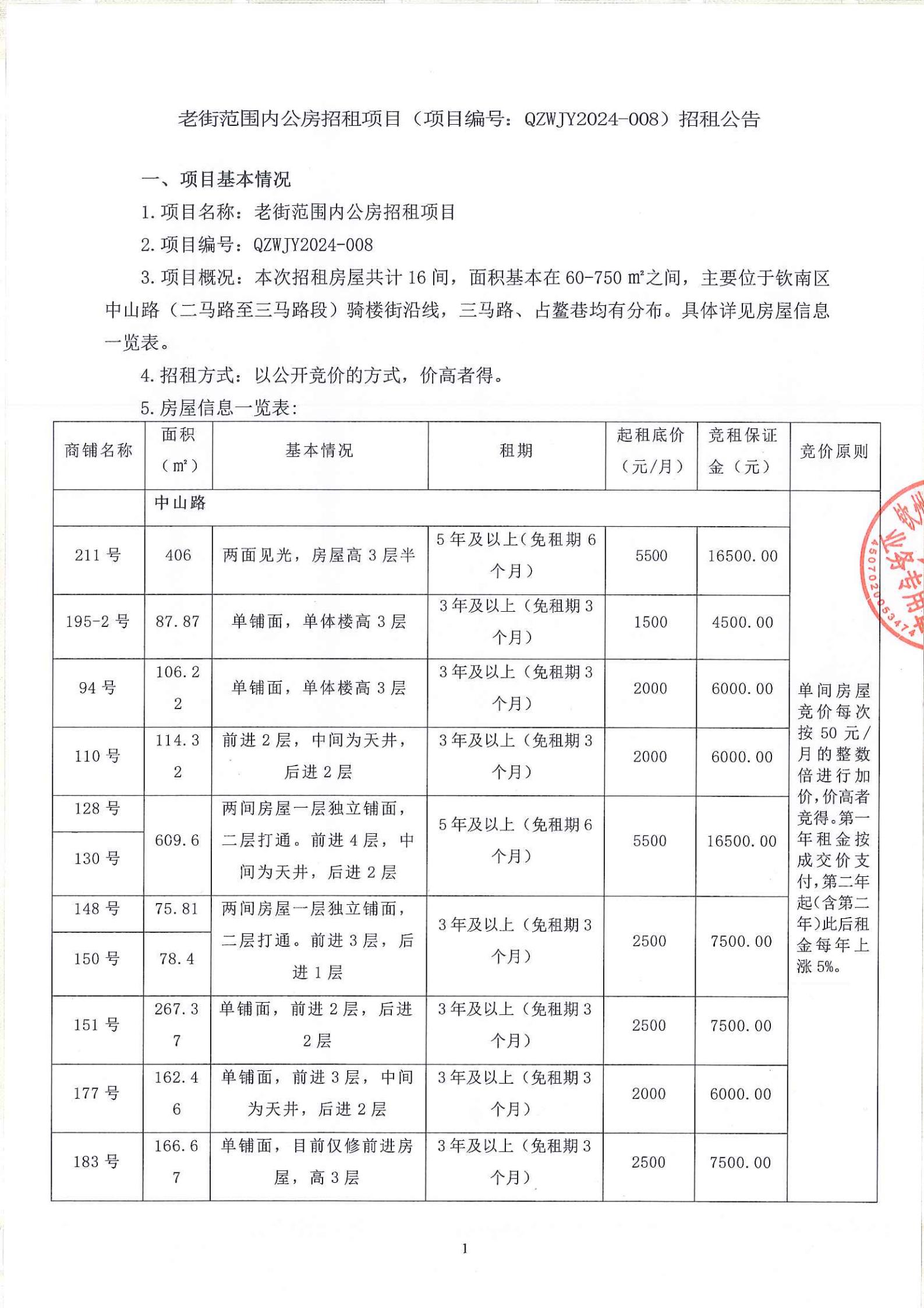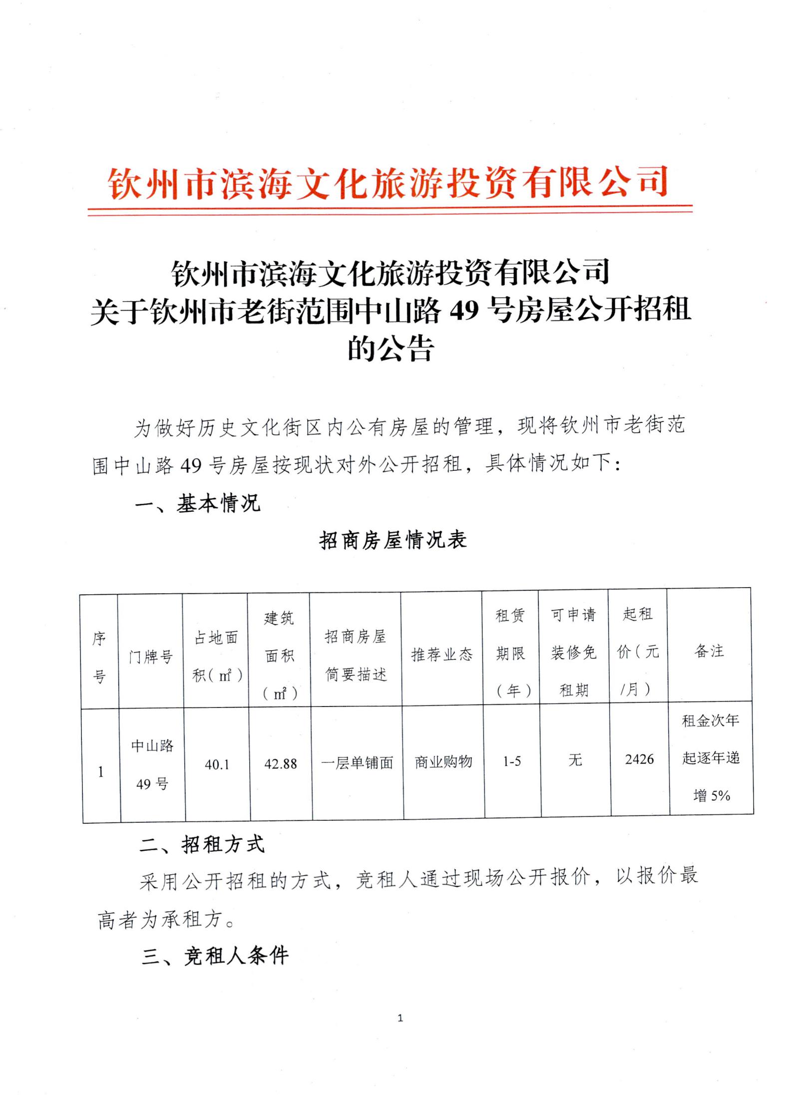 關于欽州市老街范圍中山路49號房屋公開招租的公告
