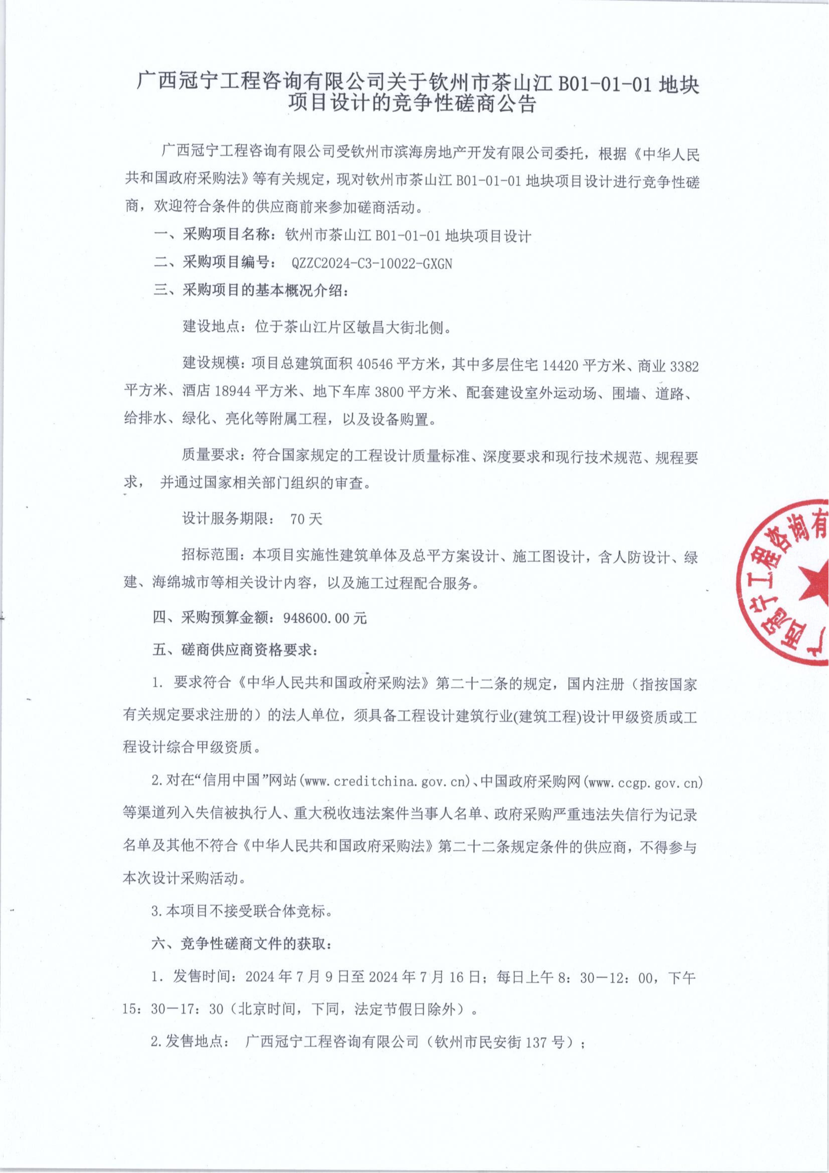 廣西冠寧工程咨詢有限公司關于欽州市茶山江B01-01-01地塊項目設計的競爭性磋商公告