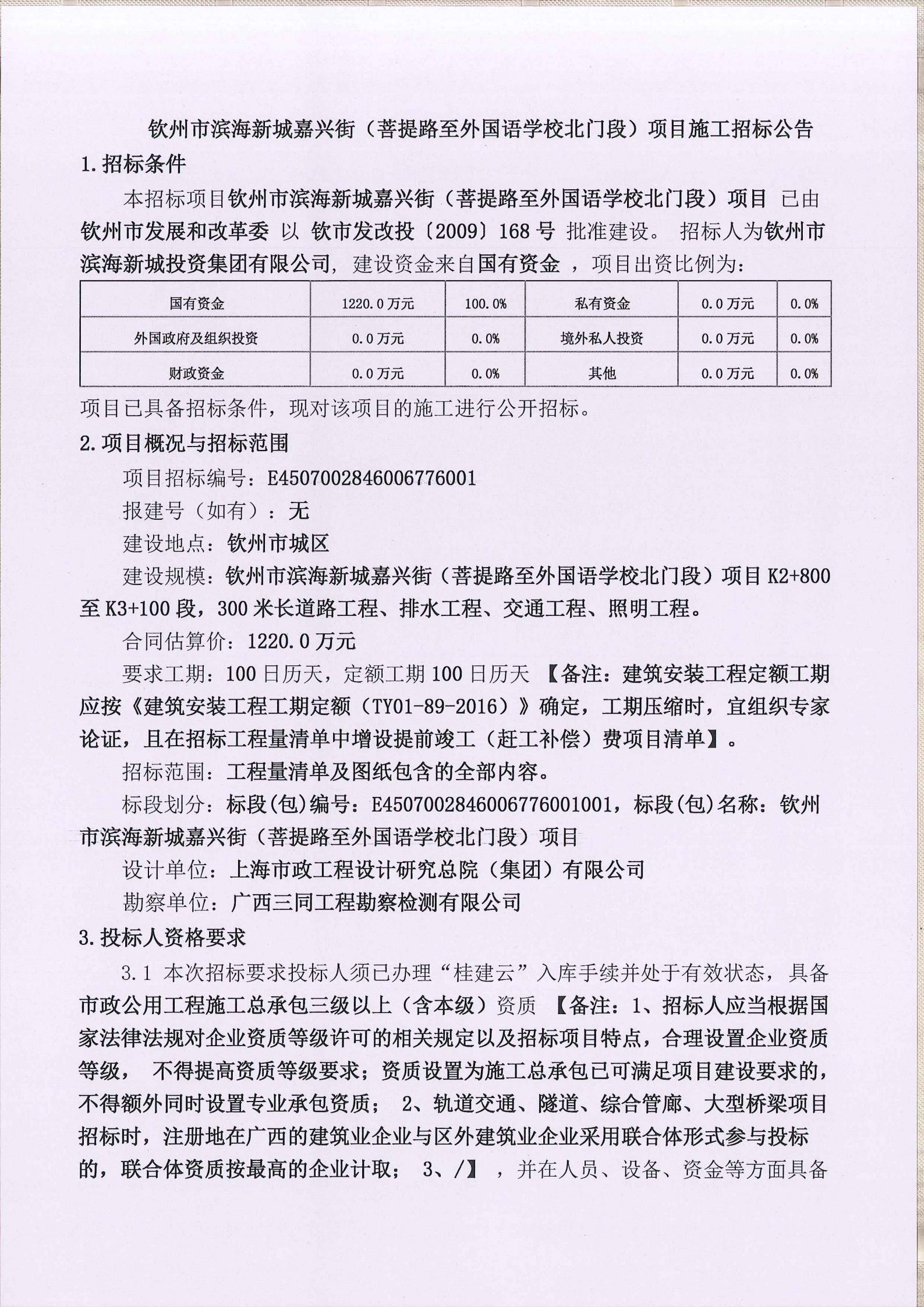 欽州市濱海新城嘉興街(菩提路至外國語學校北門段)項目施工招標公告