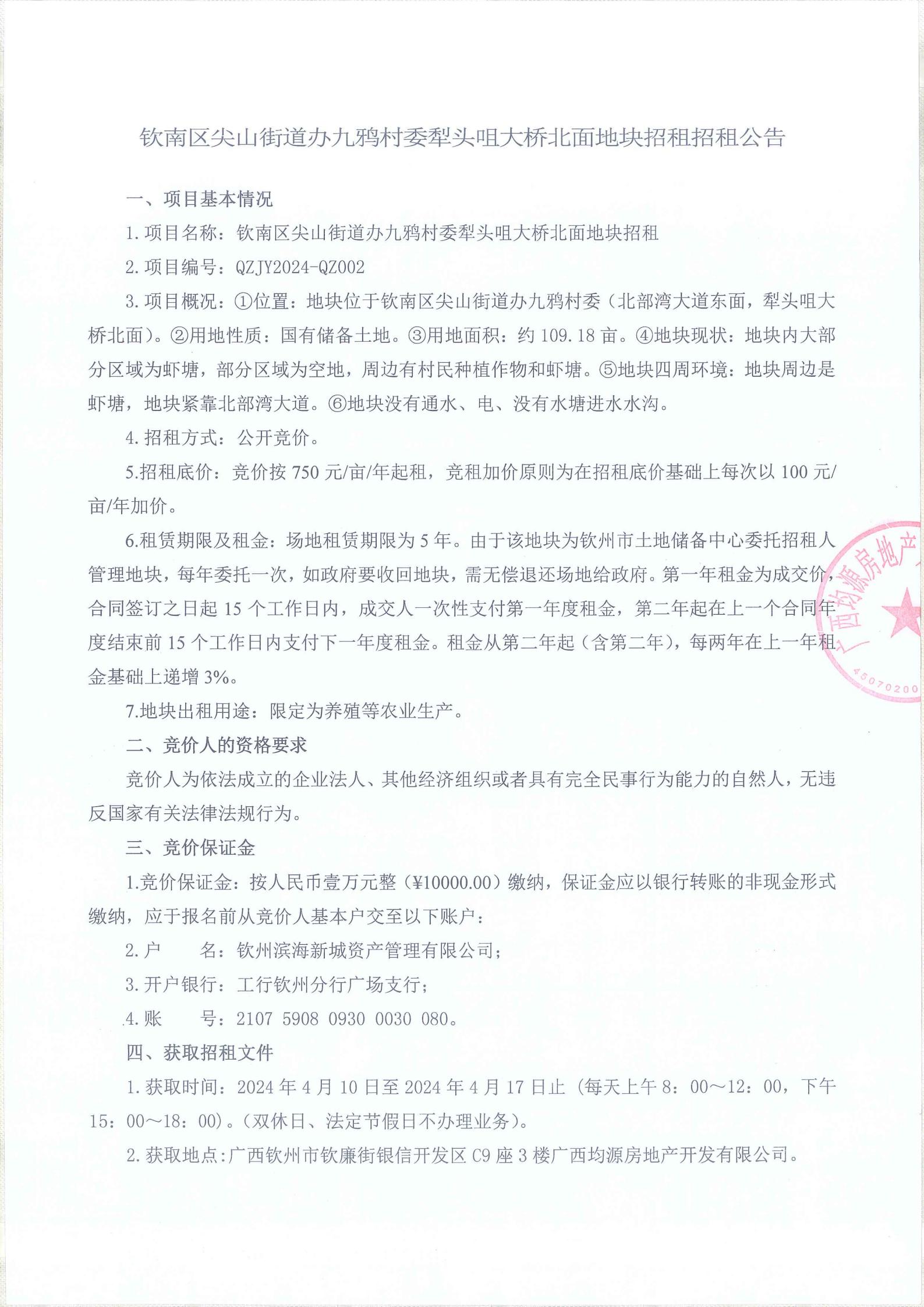 關(guān)于欽南區(qū)尖山街道辦九鴉村委梨頭咀大橋北面地塊招租成交結(jié)果公告