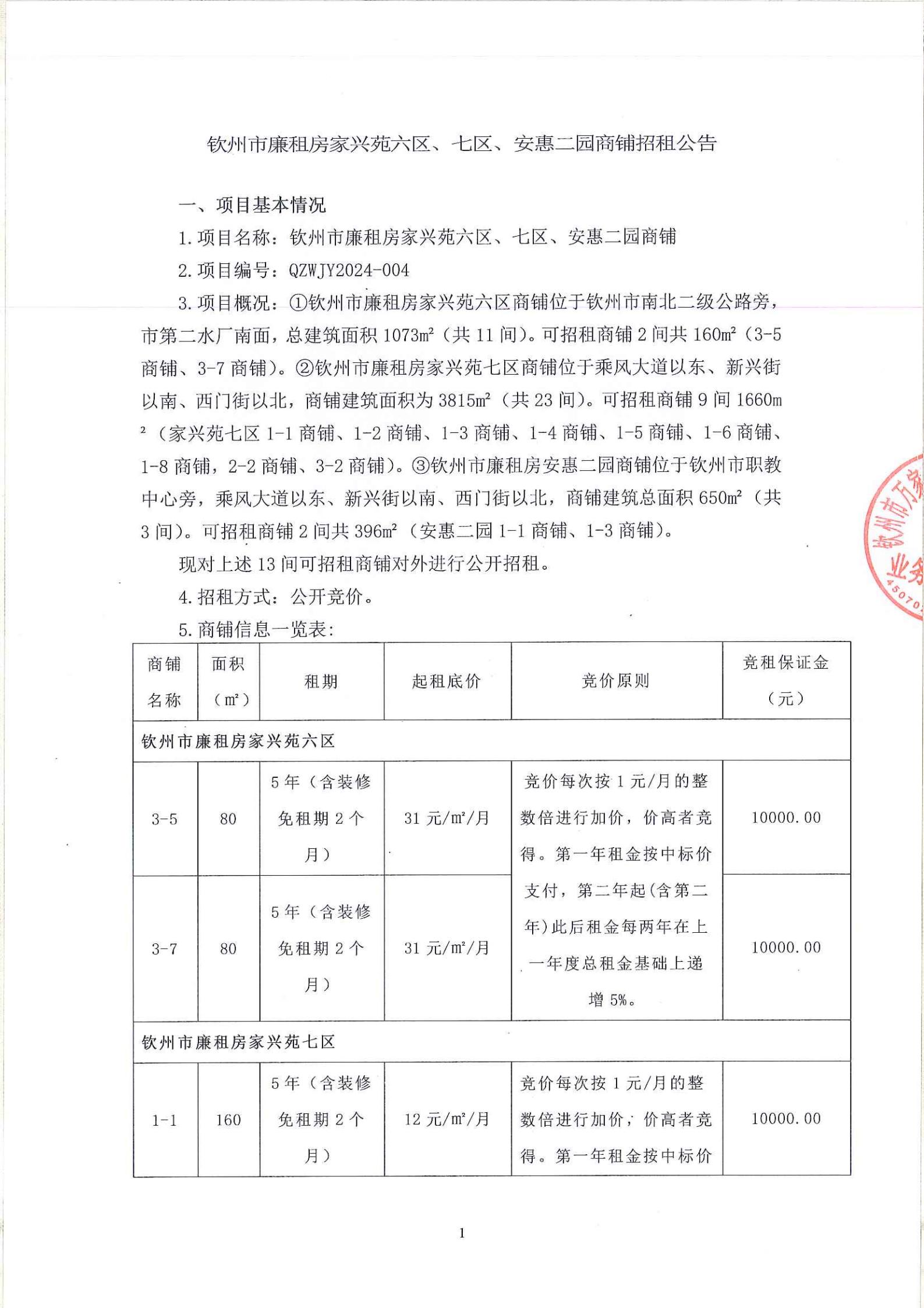 欽州市廉租房家興苑六區(qū)、七區(qū)、安惠二園商鋪招租公告