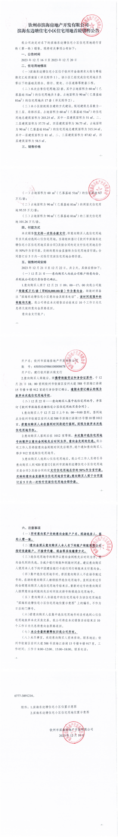 欽州市濱海房地產(chǎn)開發(fā)有限公司濱海東邊塘住宅小區(qū)住宅用地首輪銷售公告
