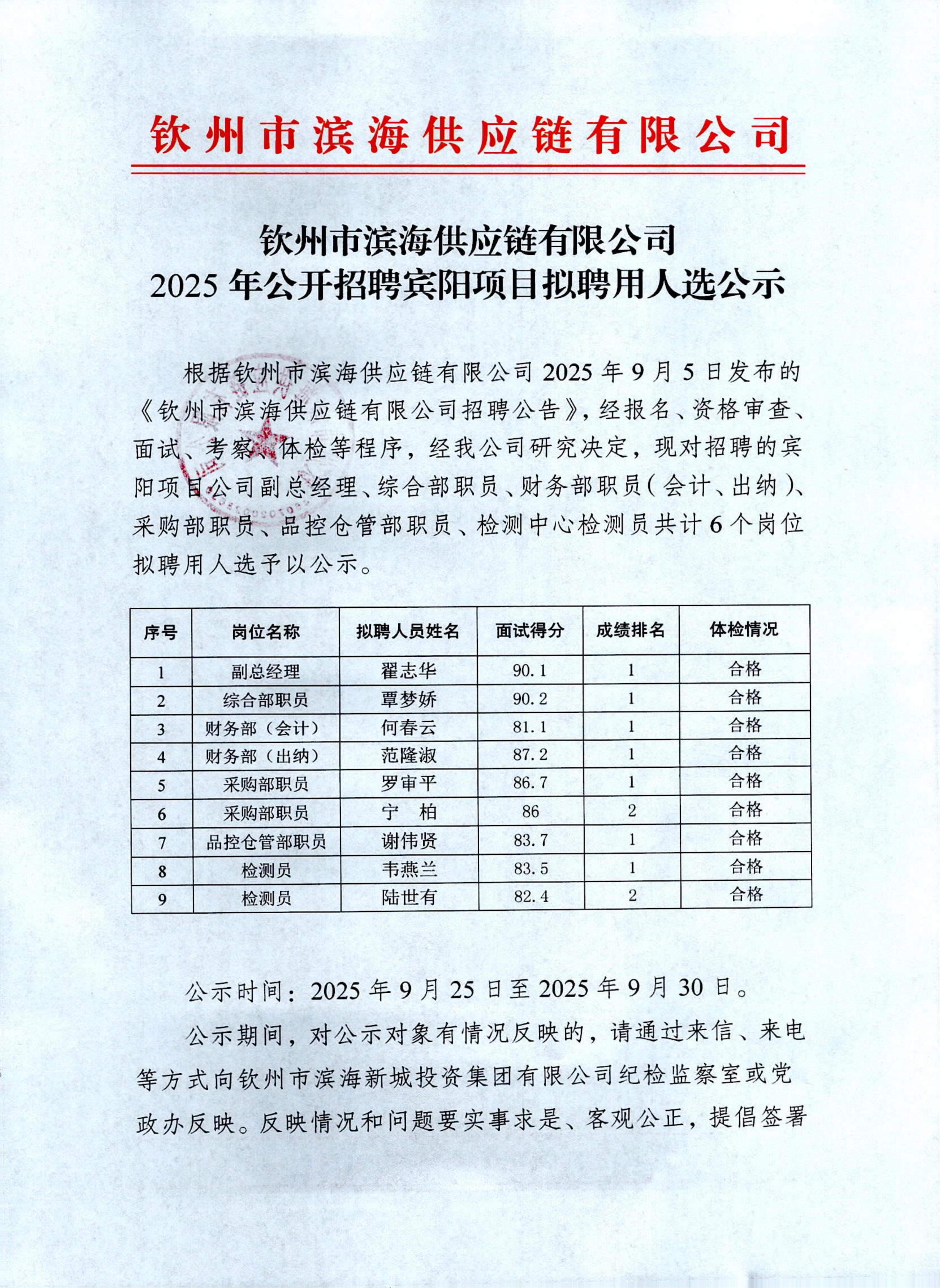 欽州市濱海供應(yīng)鏈有限公司2025年公開招聘賓陽項目擬聘用人選公示