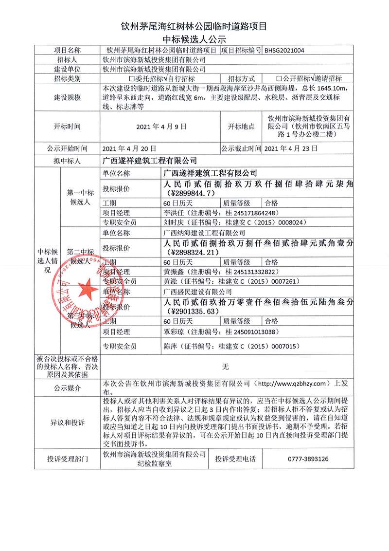中標候選人公示-欽州市濱海新城環(huán)島南路Ⅰ標段(北部灣大道至云湖路段)道路工程施工