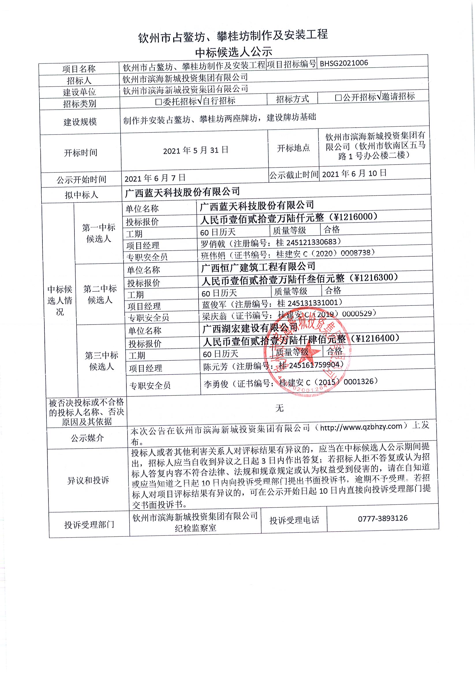 欽州市占鰲坊、攀桂坊制作及安裝工程-中標候選人公示