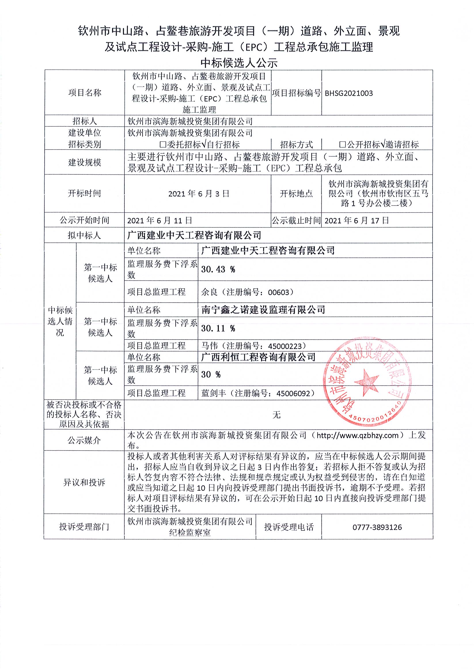 欽州市中山路、占鰲巷旅游開發(fā)項目(一期)道路、外立面、景觀及試點工程設計-采購-施工總承包監(jiān)理中標公示