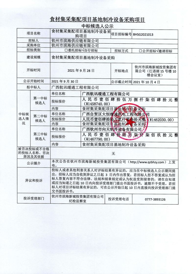 食材集采集配項目基地制冷設備采購項目中標候選人公示