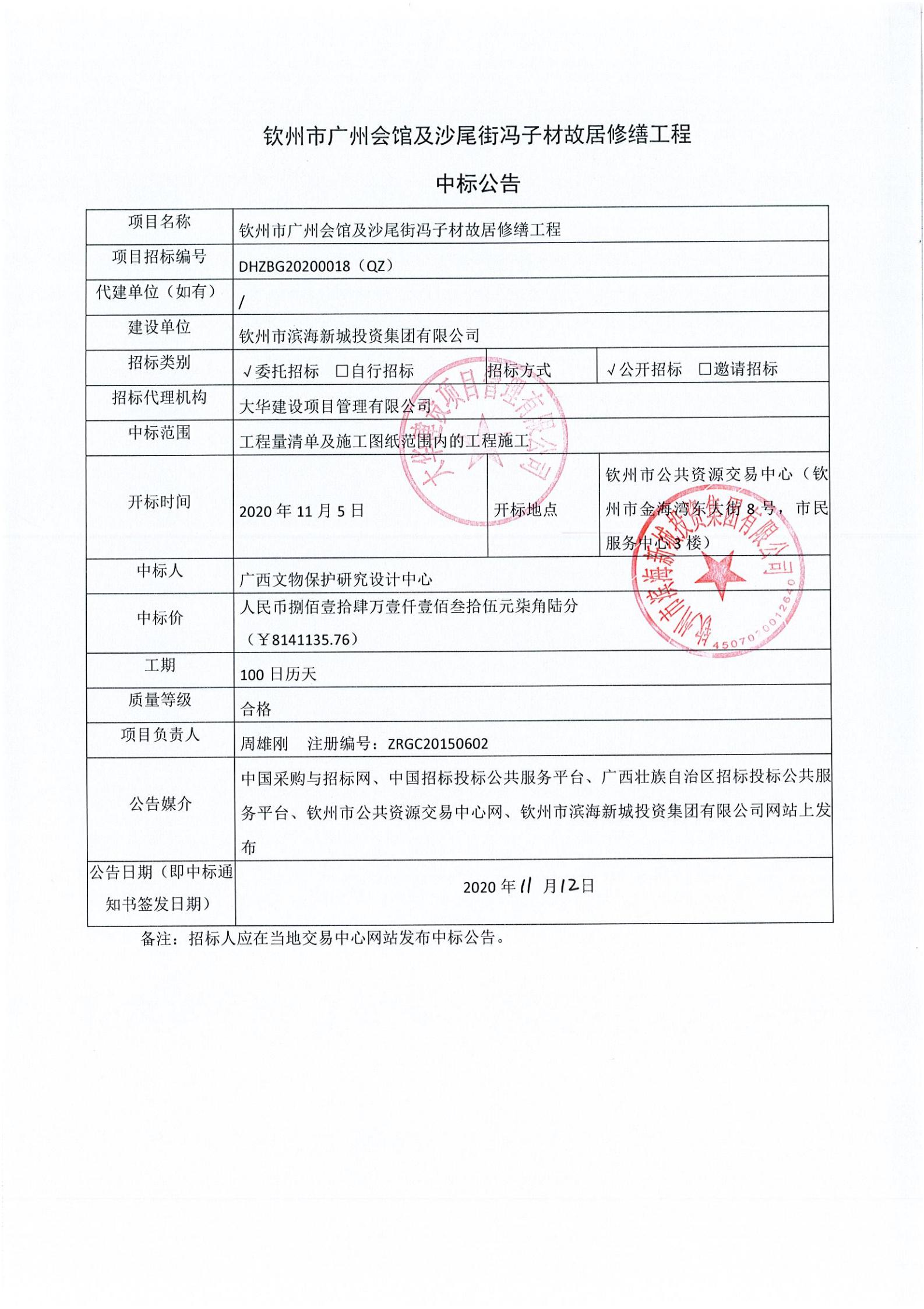 欽州市廣州會館及沙尾街馮子材故居修繕工程中標公告