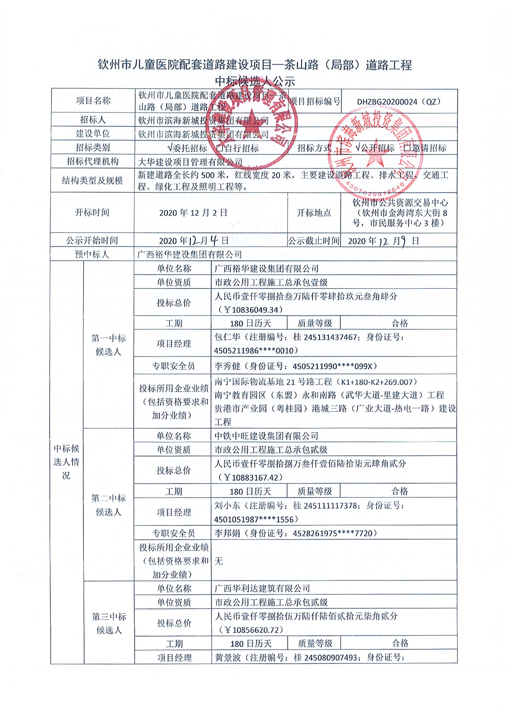 欽州市兒童醫(yī)院配套道路建設項目—茶山路(局部)道路工程中標候選人公示