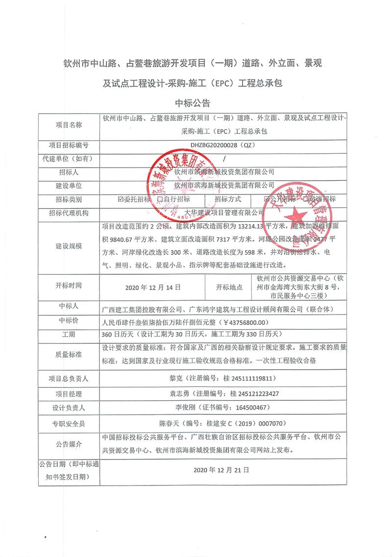 中標公示-欽州市中山路、占鰲巷旅游開發(fā)項目(一期)道路、外立面、景觀及試點工程設計-采購-施工(EPC)工程總承包中標公告