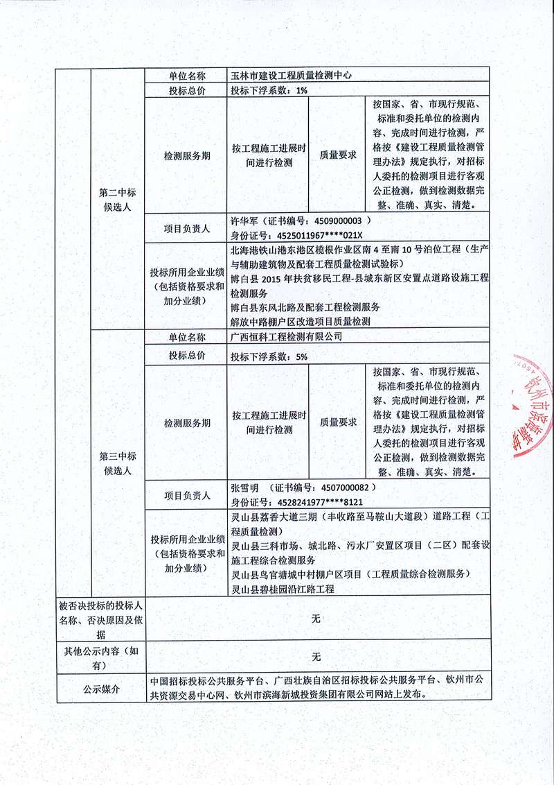 欽州市濱海新城茶山江大街項目、安州大道(珊瑚街至嘉興街段)強弱電綜合管溝及平山東大街(濱江東路-揚帆大道)強弱電綜合管溝項目綜合檢測中標候選人公示