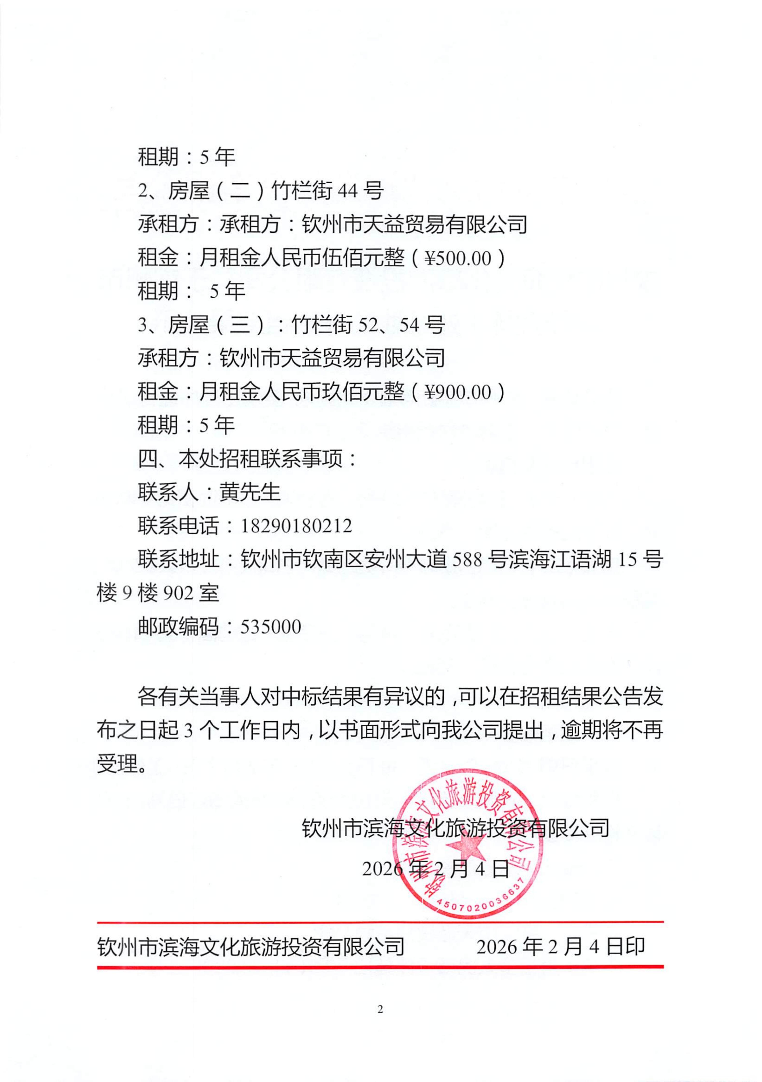 欽州市濱海文化旅游投資有限公司關于欽州市老街范圍3處公房公開招租結果公示(三馬路57、59號,竹欄街44號,竹欄街52、54號)
