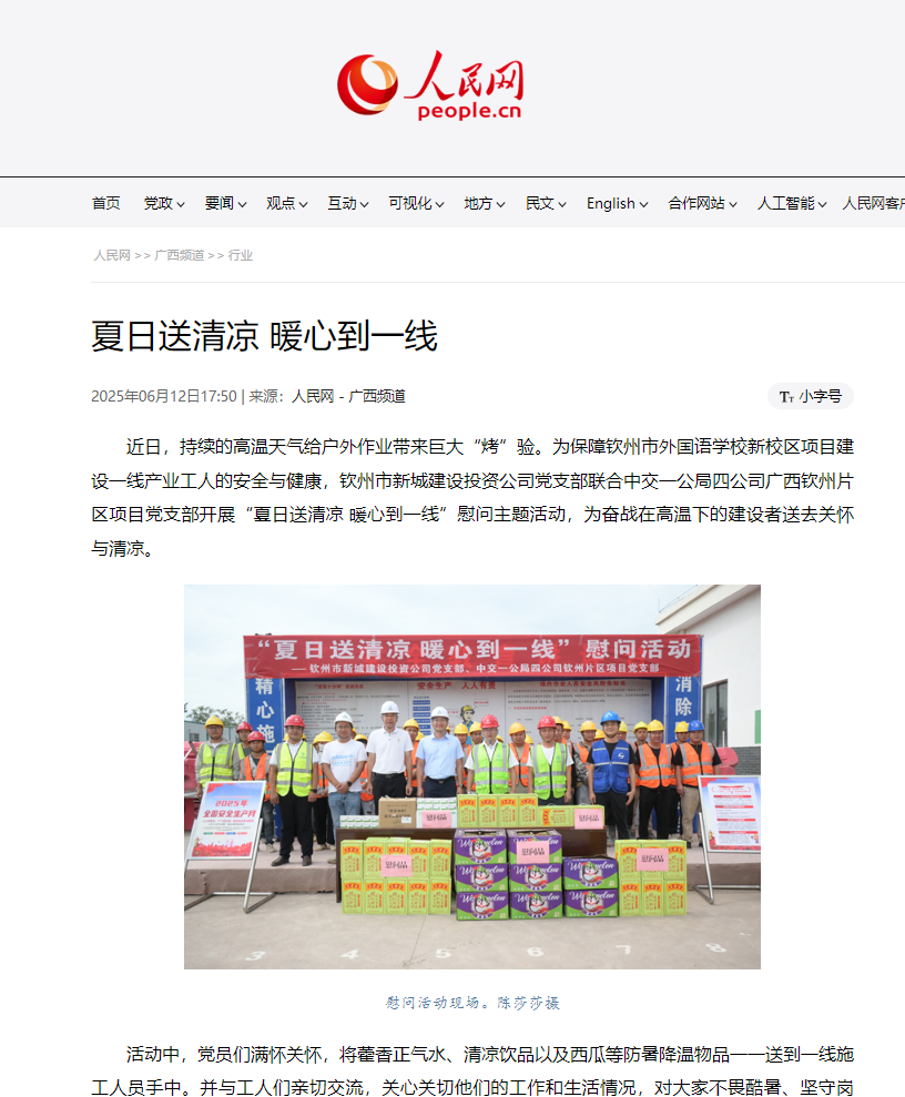 6月12日,人民網(wǎng)-廣西頻道以《夏日送清涼 暖心到一線》為題報道市濱投集團公司黨委下屬建投公司黨支部聯(lián)合中交一公局四公司廣西欽州片區(qū)項目黨支部開展“夏日送清涼 暖心到一線”慰問主題活動,為奮戰(zhàn)在高溫下的建設(shè)者送去關(guān)懷與清涼,全文如下。