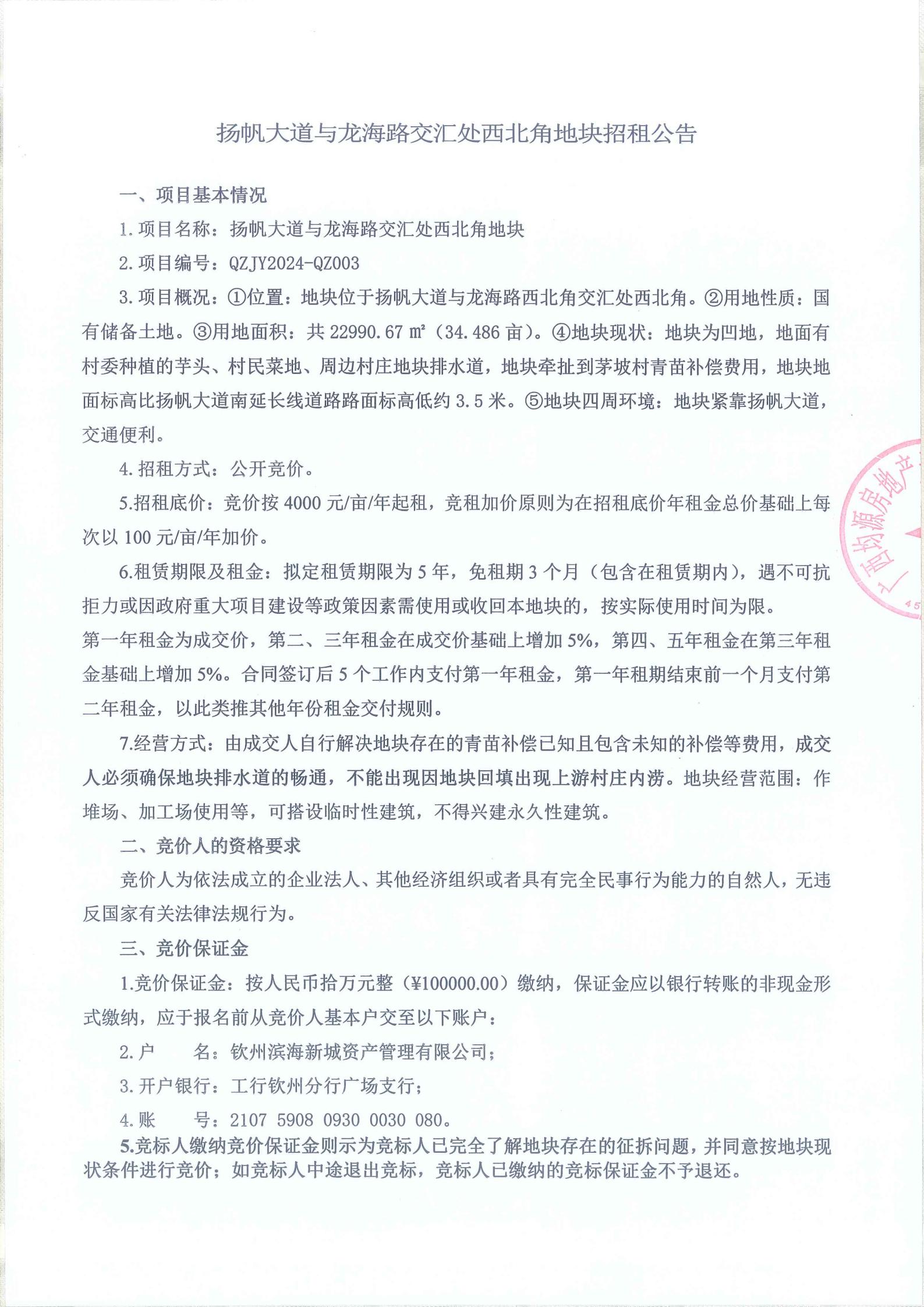 揚(yáng)帆大道與龍海路交匯處西北角地塊招租公告